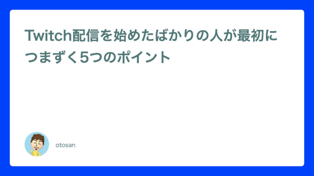 おとさんです。 Twitchでゲーム配信をしています。 このブログでは、ゲーム配信の始め方や配信環境の整え方、 配信を続けるための考え方などを、実体験をもとに解説しています。 これからゲーム配信を始めたい方や、 配信を続ける中で悩んでいる方の参考になればうれしいです。 ▶ プロフィールはこちら ▶ まず読んでほしいおすすめ10記事
